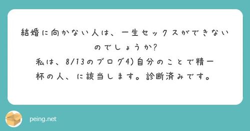 peing.net 結婚に向かない人は、一生セックスができないのでしょうか?私は、8/13のブログの4)自分のことで精一杯の人、に該当します。診断済みです。 まず、結婚に向かない人って見方が間違っていますよね。 要は、結婚相手とどう向き合うかですから。 ガチ…