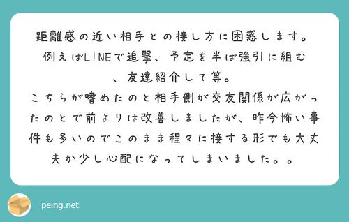peing.net 距離感の近い相手との接し方に困惑します。例えば、LINEで追撃、予定を半ば強引に組む、友達を紹介してと言ってくる等、 こちらがいなせた(相談ではたしなむですが、何を嗜むのかよくわからないので変えています)のと、相手側の交友関係が広がっ…